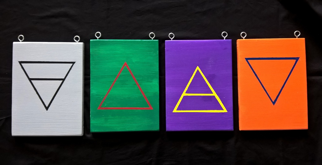 In the Golden Dawn Hermetic Tradition there is a highly important ritual, the Watchtower Ritual. It is done before every magickal working invoking the elementals at the four quarters using pentagrams, God names and Enochian magick. The structure of this ritual was copied later on and passed to other western magical traditions. Four elemental tablets displaying the elemental triangles hung on the walls, though in the Golden Dawn, the four Watchtower Tablets are more complex and they have their own life. Another variation, maybe for a Wiccan Circle, is to put the ones with the elemental triangles just outside the circle and have the elemental candle inside the circle to illuminate the tablet. Those tablets help with the focussing, orientation and invocation of the energies in the space.